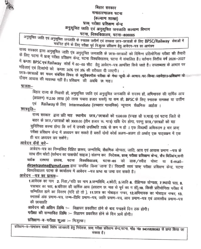 यदि आप या आपके जानने वाले बिहार के SC/ST वर्ग के छात्र हैं जो BPSC या Railway की तैयारी करना चाहते हैं, तो यह योजना एक बेहतरीन अवसर है। जल्दी आवेदन करें क्योंकि आवेदन की अंतिम तिथि विज्ञापन से केवल 15 दिन बाद होती है।